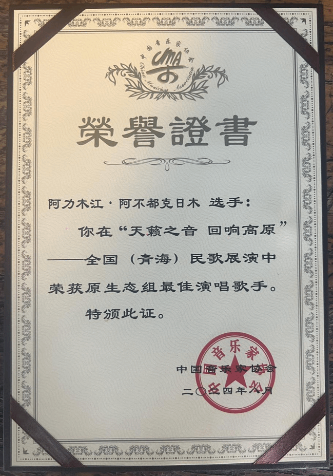 阿力木江·阿不都克日木的获奖证书