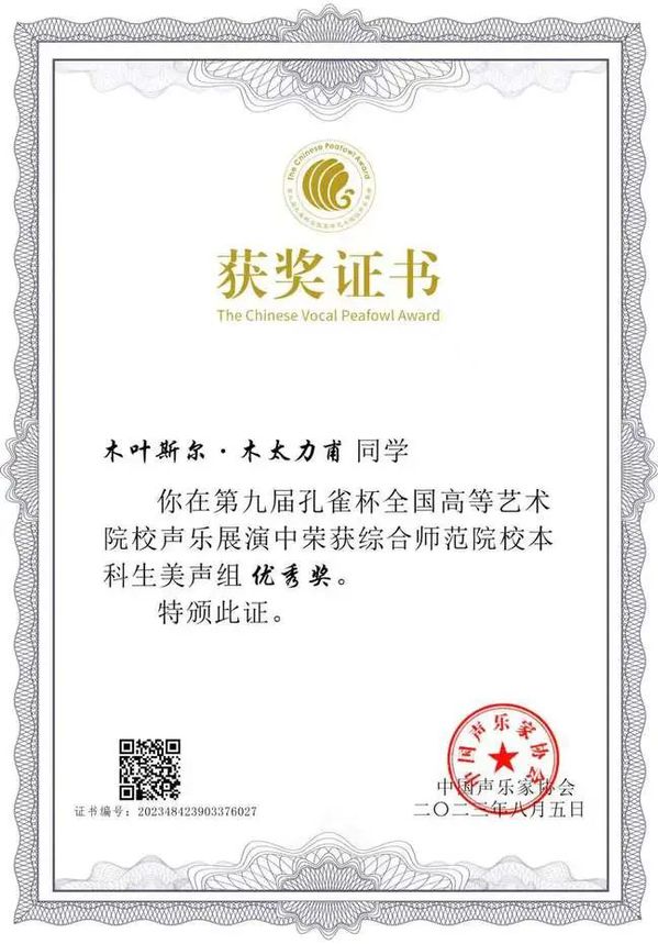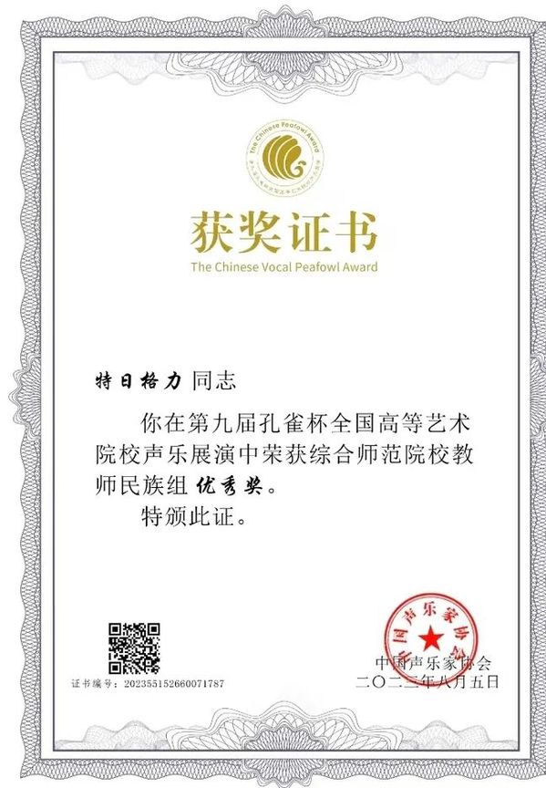 教师李晓红指导的学生后腾荣获综合师范院校美声本科组金孔雀杯,特日格力指导的学生木叶斯尔·木太力甫荣获综合师范院校美声本科组优秀奖。