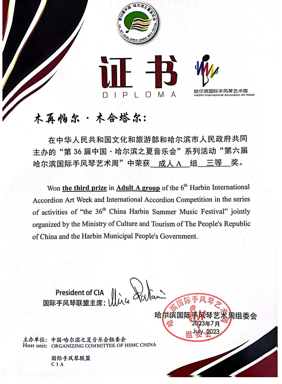 音乐学22-1班木再帕尔·木合塔尔荣获第六届中国·哈尔滨之夏音乐会国际手风琴艺术周活动成人A组三等奖