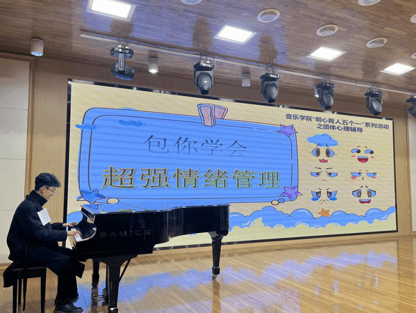 音乐在调节情绪中有奇妙的作用,它可以跨越语言和文化的障碍,直接触动心灵,成为调节情绪的得力助手。随着带领者的讲解,23-7班李润泽分别演奏了两段悲伤和欢快的音乐供大家体验,当悠扬的旋律响起,活动现场充满着神奇的魔力,所有的压力和烦恼都在这一刻烟消云散。