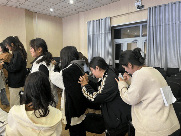 本次活动的暖场环节为身体触碰游戏。同学们需要用脚尖、膝盖轻轻触碰任意五位小伙伴,在轻松的氛围中打破隔阂,感受人际交往的温暖和乐趣。结束后,同学们纷纷表示:“感到很开心,认为人际交往也没有那么难。”互动最后,带领者总结说到:“其实,在接触的过程中,仿佛是在搭建一座小小的桥梁,连接起彼此的心灵,没有复杂的语言交流,却有着直接的身体互动,让人真切感受到他人的存在,有时候,一个简单的动作、一个真诚的微笑,就足以拉进人与人之间的距离。”