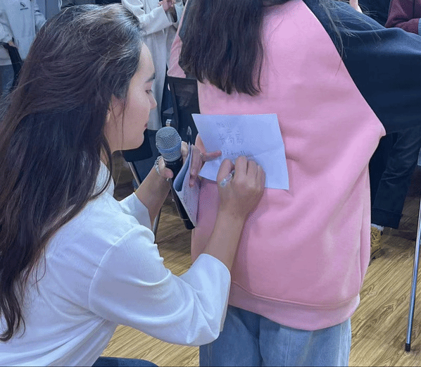 活动由“把祝福带走”这一温馨的环节结尾,参与者在其他小伙伴背后的白纸上写下了最美好的祝福,送上了最真挚的祝愿。带领者说到:“同学们在活动结束后记得看看背后的祝福,感受来自他人的关心和鼓励,体验这份温暖。在人生的道路上,我们并不孤单,还有一群可爱的人给过我们力量。”