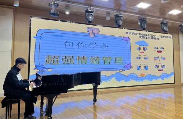 音乐在调节情绪中有奇妙的作用,它可以跨越语言和文化的障碍,直接触动心灵,成为调节情绪的得力助手。随着带领者的讲解,23-7班李润泽分别演奏了两段悲伤和欢快的音乐供大家体验,当悠扬的旋律响起,活动现场充满着神奇的魔力,所有的压力和烦恼都在这一刻烟消云散。