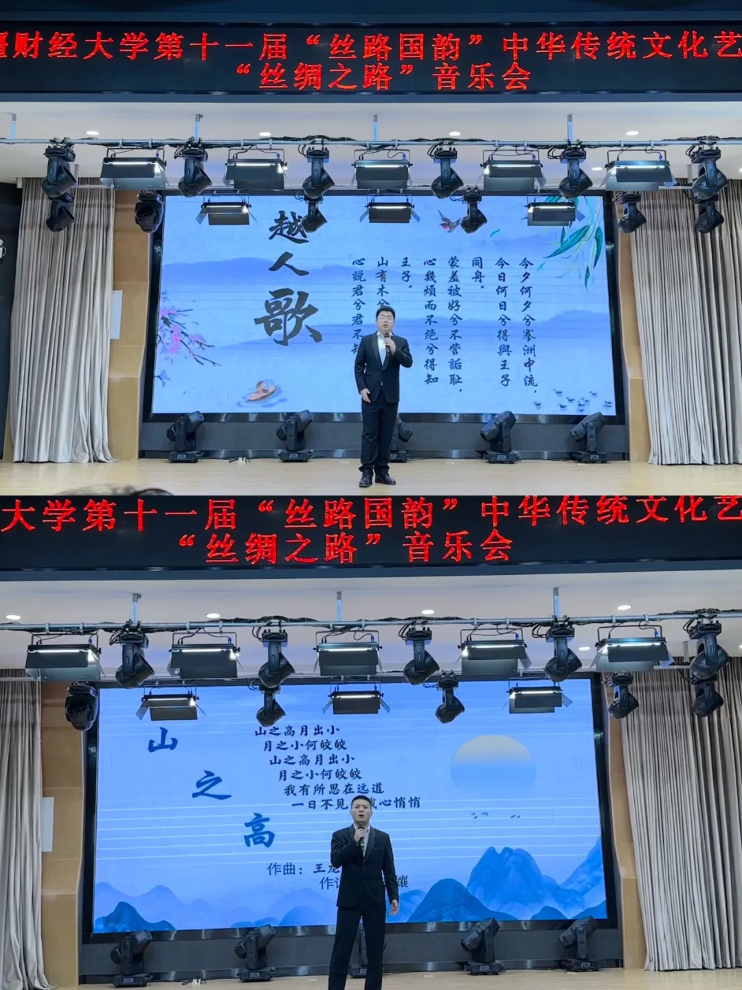 的同学们演唱了两首古诗词《山之高》《越人歌》,将古诗词以音乐的形式展示,令在场的新疆财经大学师生们耳目一新,震撼全场。